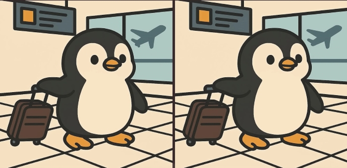 ¿Estás listo para el siguiente reto? Observa detenidamente dos imágenes de un simpático pingüino cargando equipaje en el aeropuerto. A primera vista pueden parecer idénticas, pero en ellas se esconden 3 pequeñas diferencias. ¿Crees que puedes encontrarlas todas en 61 segundos? ¡Inténtalo y pon a prueba tu agudeza vis!