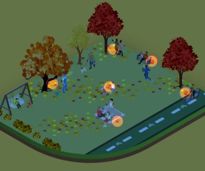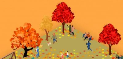 La imagen es de un parque otoñal por el que pasean personas y niños. Todos están ocupados haciendo sus cosas, pero junto a algunos de ellos están las calabazas que buscamos.