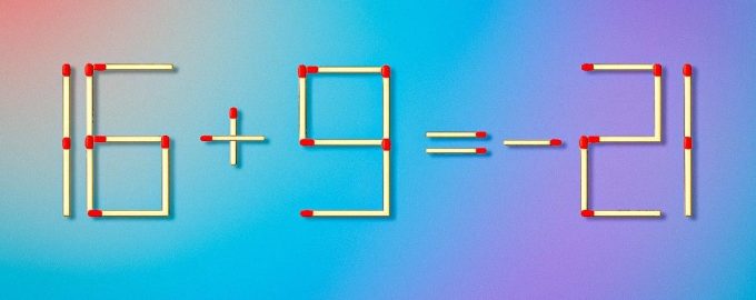 Como puedes ver, tienes que quitar la coincidencia superior derecha del número 9 y añadirla al signo «-» que precede al número 21. Como resultado, el nueve se convertirá en 5, y el menos en más. Así obtenemos la igdad correcta: 16 + 5 = +21.