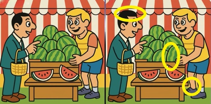 ¿Estás preparado para el reto? Fíjate bien en las dos imágenes de un hombre comprando una sandía. A primera vista pueden parecer iges, pero hay 3 pequeñas diferencias. ¿Crees que puedes encontrarlas todas en 27 segundos? ¡Inténtalo y pon a prueba tu agudeza vis!