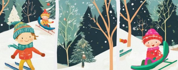 Delante de ti hay un grupo de niños felices disfrutando de la nieve y del auténtico clima invernal en el bosque. Los más pequeños van en trineo y sus amigos mayores esquían.