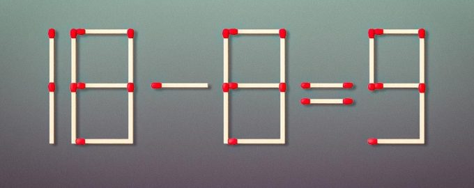 A continión verás una imagen en la que se plantea la igdad 18-8=9 con la ayuda de cerillas. Obviamente, es matemáticamente incorrecta, porque la diferencia de estos números debería ser 10.